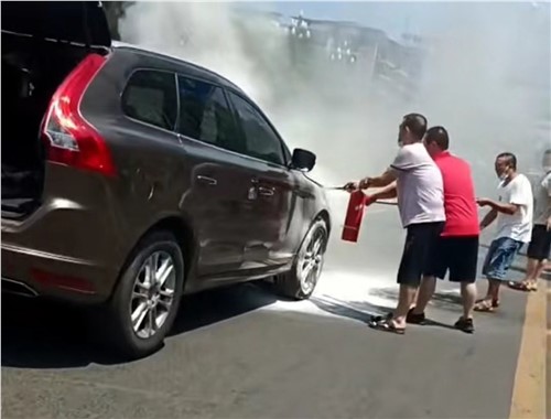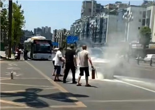 停車后,余善全拿起車內(nèi)滅火器便向發(fā)生燃燒的汽車沖去。此時(shí),燃燒車輛駕駛員正站在路邊打電話求救。當(dāng)余善全進(jìn)行滅火時(shí),另一位公交車駕駛員任俊全也拿著滅火器參與滅火。與此同時(shí),附近店鋪內(nèi)沖出兩名男子,手持滅火器加入滅火隊(duì)伍。很快,火勢被徹底撲滅。