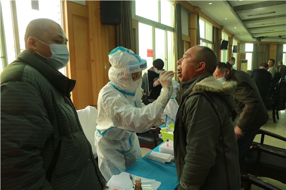檢測過程中,被檢人員分時段、分批次進入檢測現場并全程佩戴口罩、測量體溫、有序排隊,現場信息核對、領取條碼、逐一進行核酸檢測。
